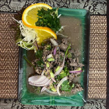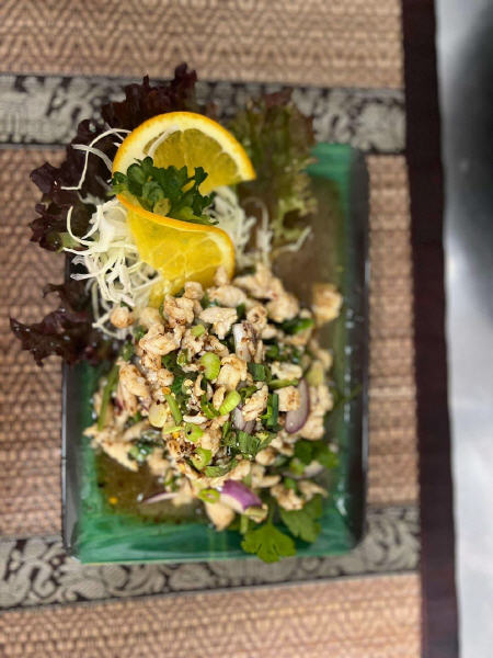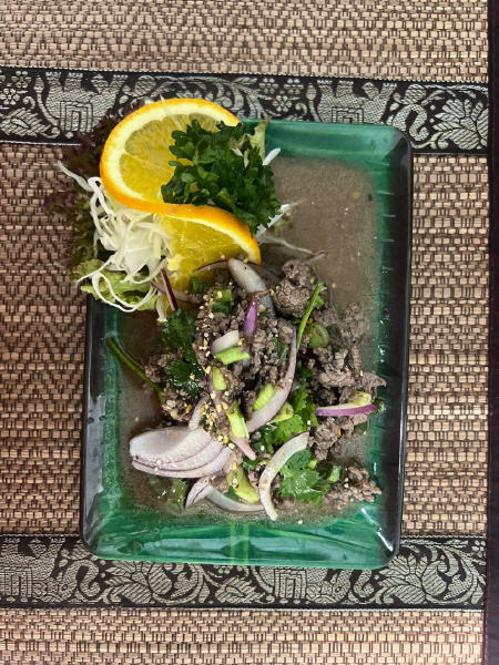 Ein authentisches thailändisches Gericht, das als Vorspeise serviert wird, ist Laab, bestehend aus einer Fleischauswahl mit Hähnchen-, Schweine- oder Rindfleisch, das mit zerstoßenem gerösteten Reis in einer hausgemachten, scharfen Laab-Soße gewürzt ist. Die Kombination aus zartem Fleisch, zerstossenem geröstetem Reis und würziger Soße ergibt ein geschmackvolles und traditionelles Gericht, das die Aromen der thailändischen Küche perfekt vereint. Eine scharfe und köstliche Vorspeise, die die Gäste auf eine kulinarische Reise nach Thailand mitnimmt.